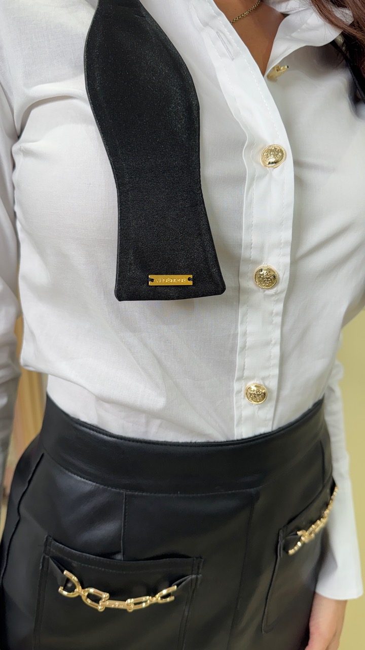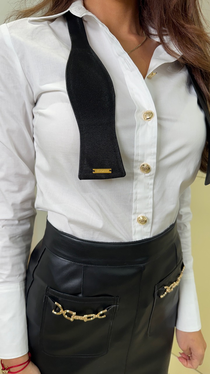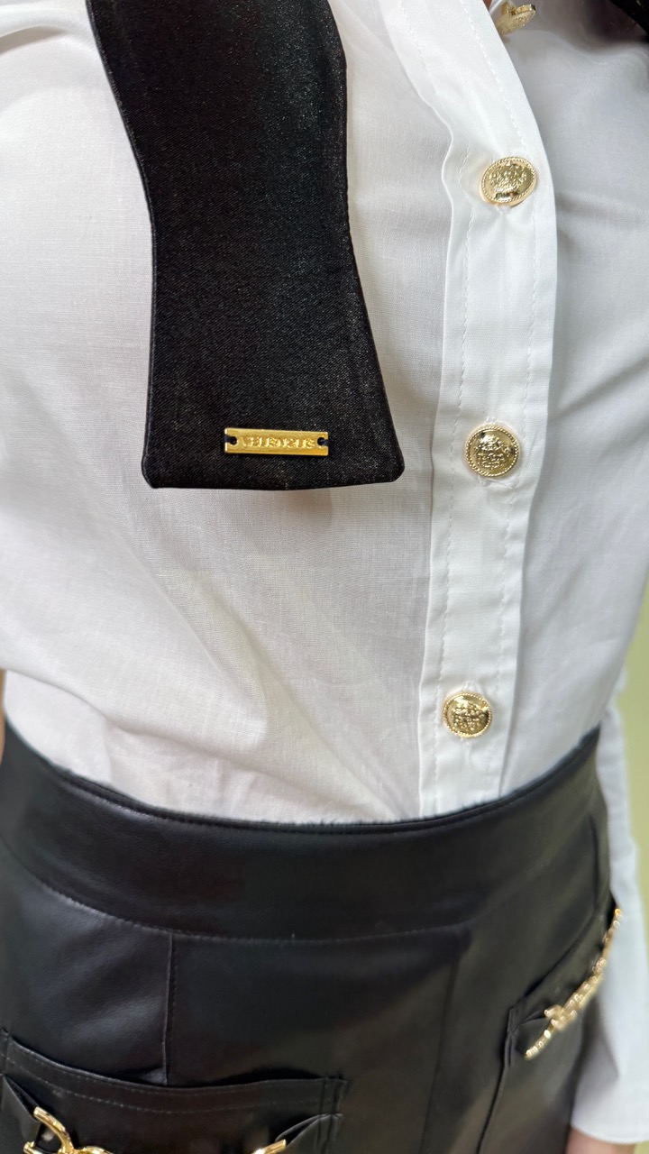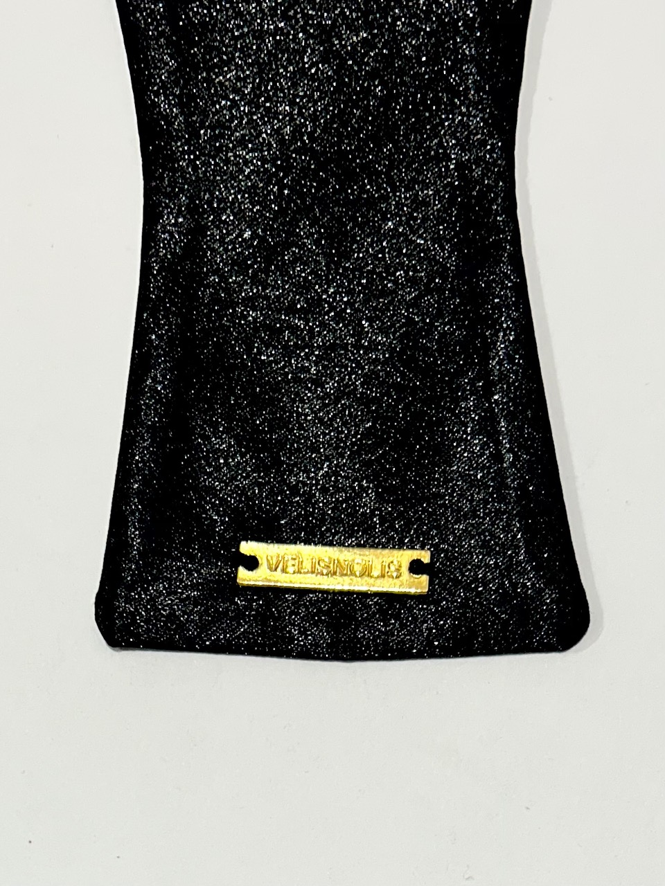 Súčasťou blúzky je odnímateľný čierny dámsky viazací saténový motýlik s jedinečným upevnením aby nepadal. Motýlik je doplnený 14 karátovým pozláteným logom VELISNOLIS.