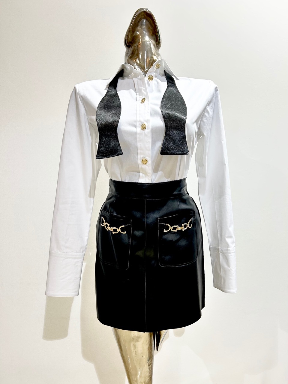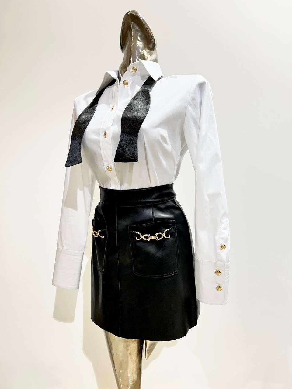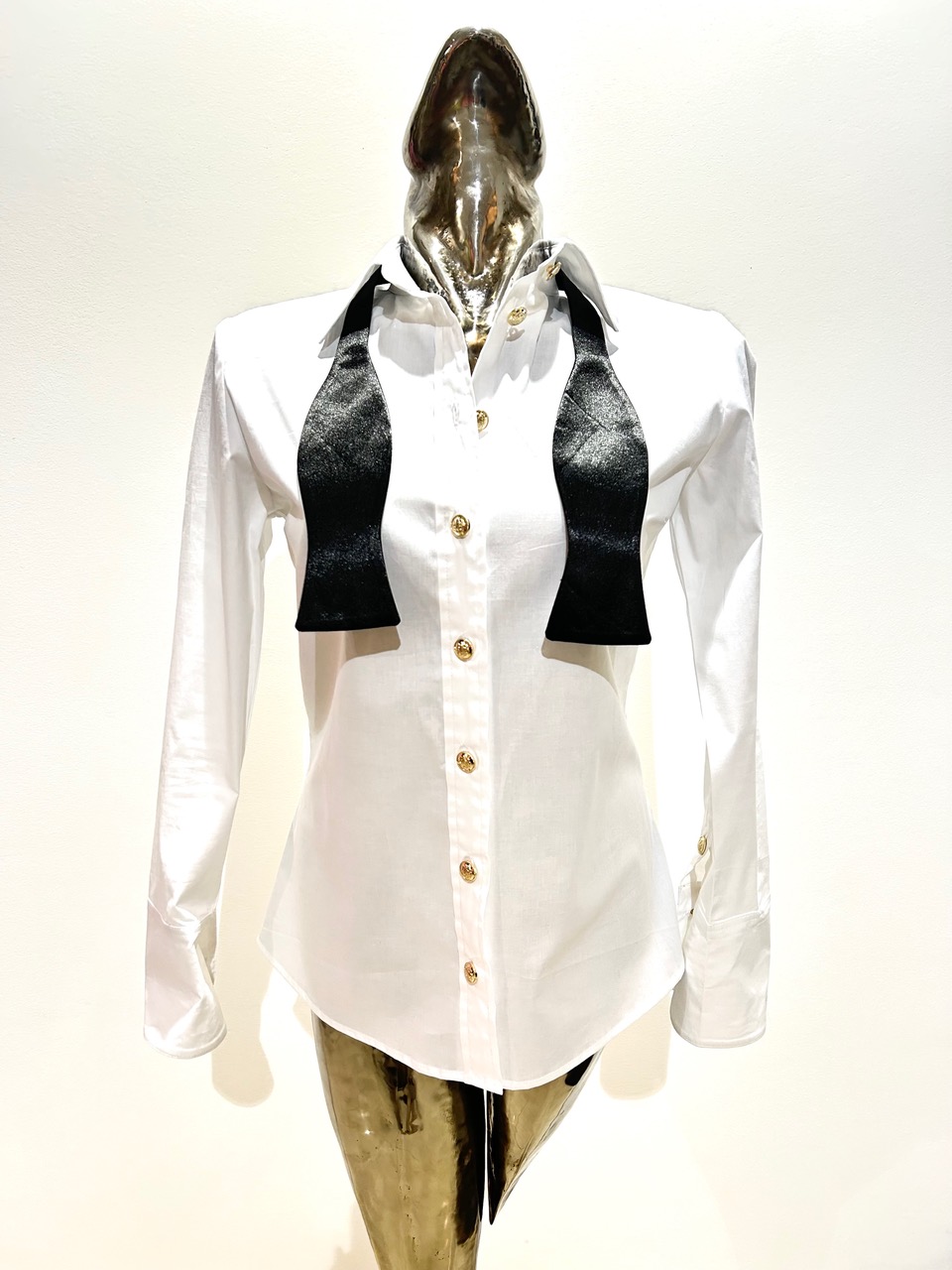 Súčasťou blúzky je odnímateľný čierny dámsky viazací saténový motýlik s jedinečným upevnením aby nepadal. Motýlik je doplnený 14 karátovým pozláteným logom VELISNOLIS.