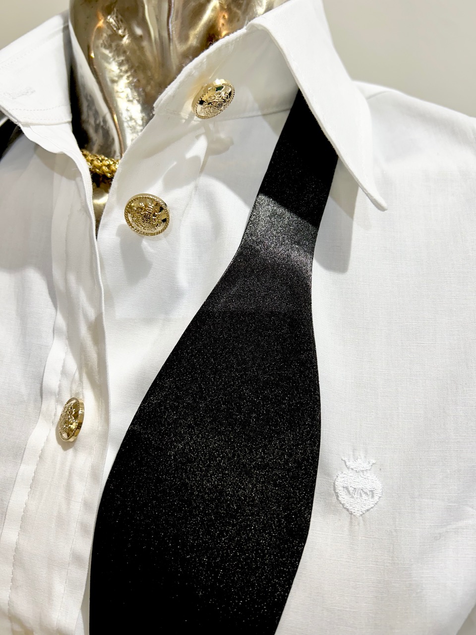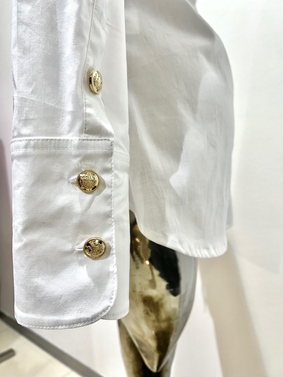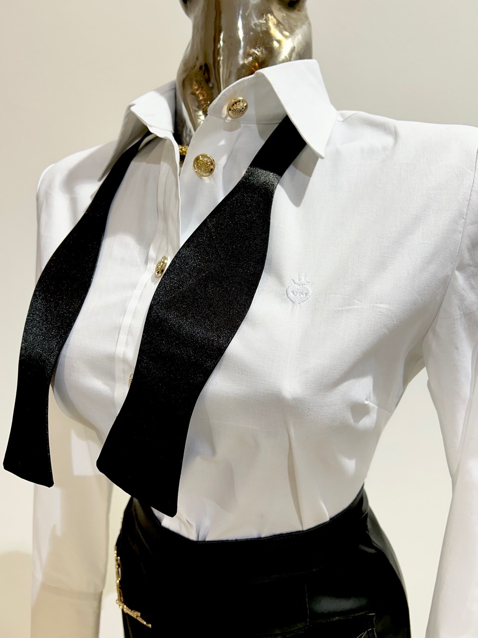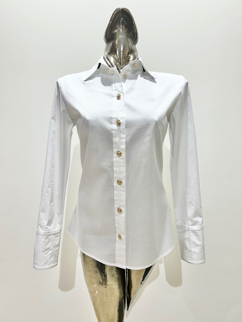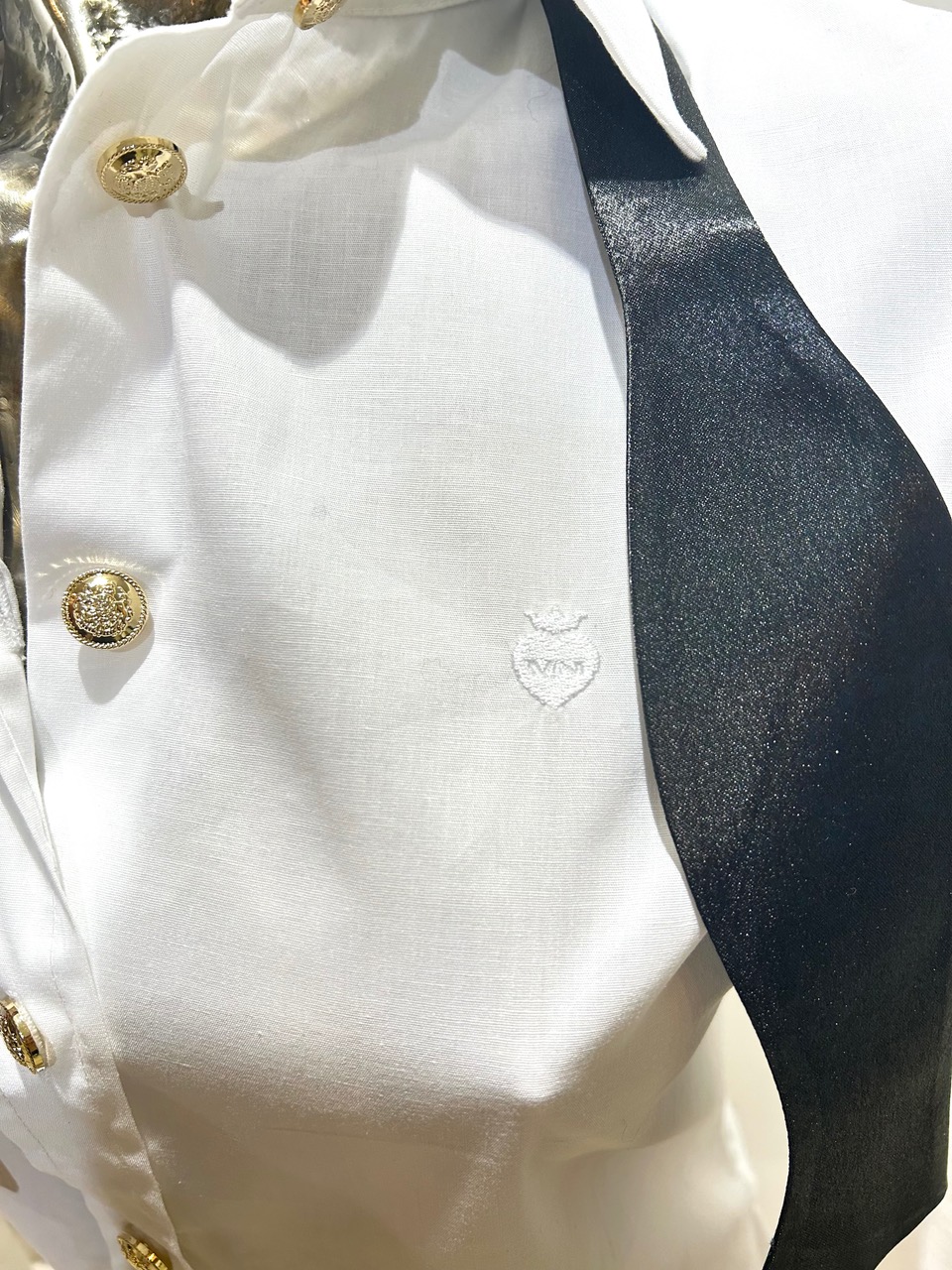 Biela bavlnená blúzka s elastanom má krásny úzky strih a zlatisté ozdobné gombíky. Doplnená je vyšívaným logom VN srdce.