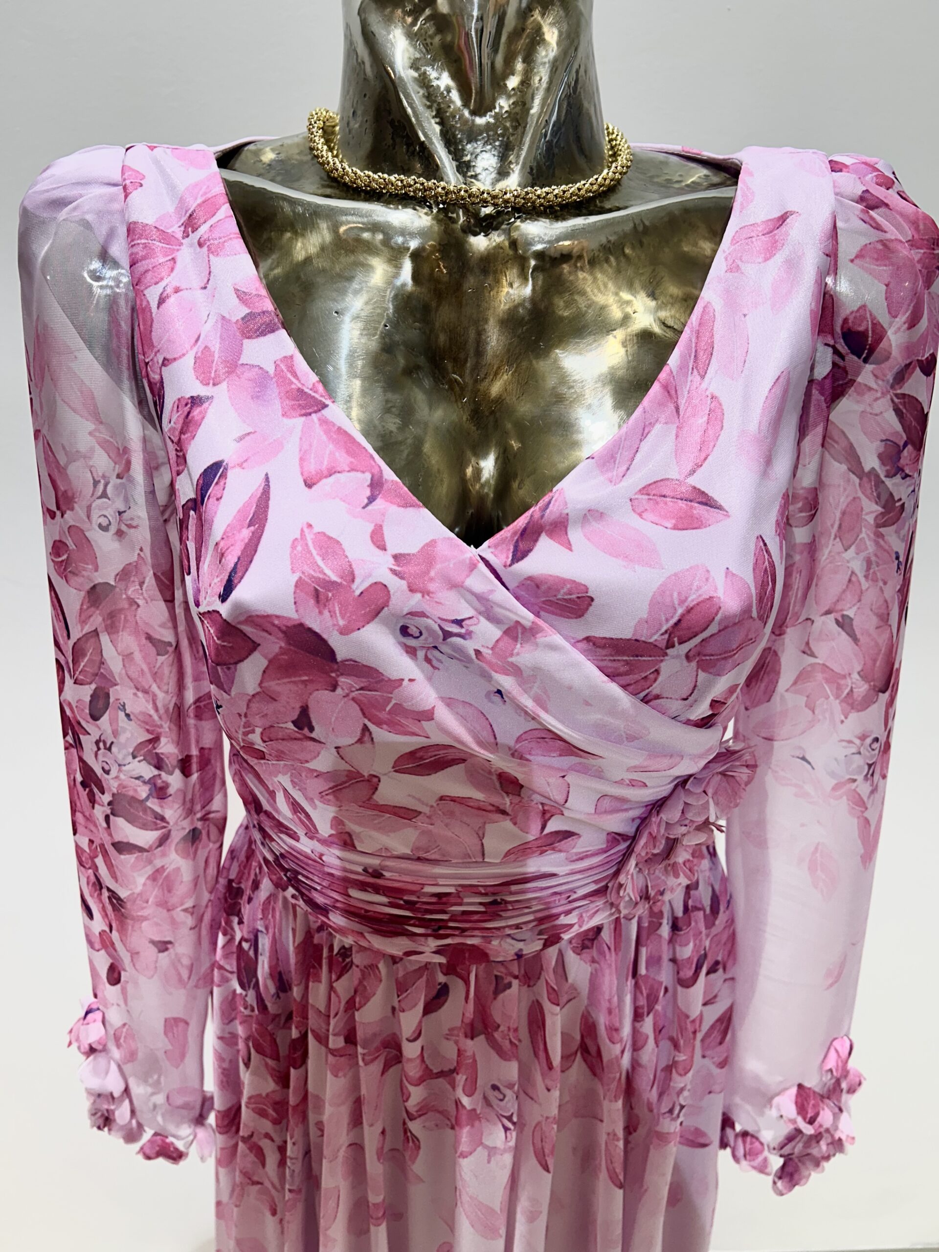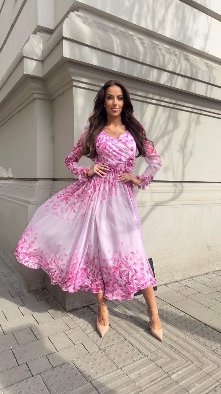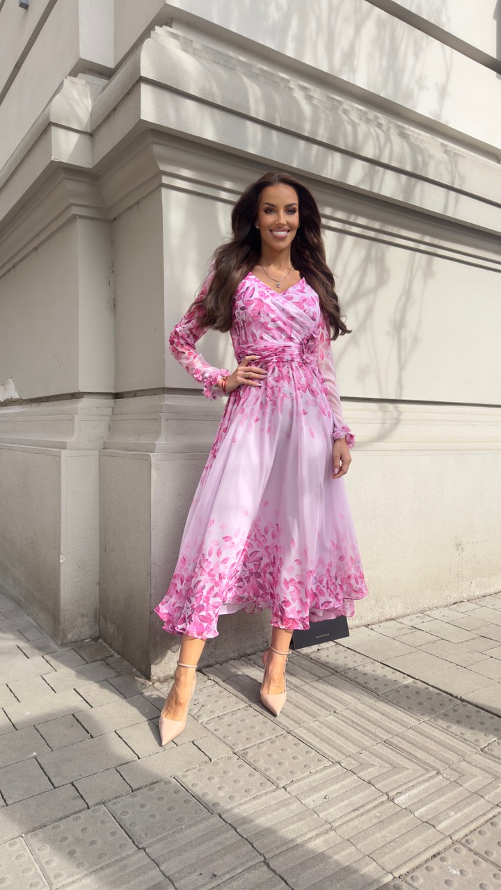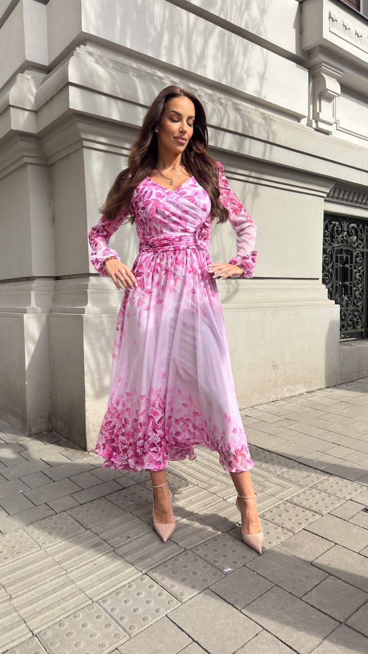 Šaty s jemným opaskom sú z ľahkého materiálu a sú podšité. Prekrásny ženský strih doplnený riasením v páse a kvetmi.