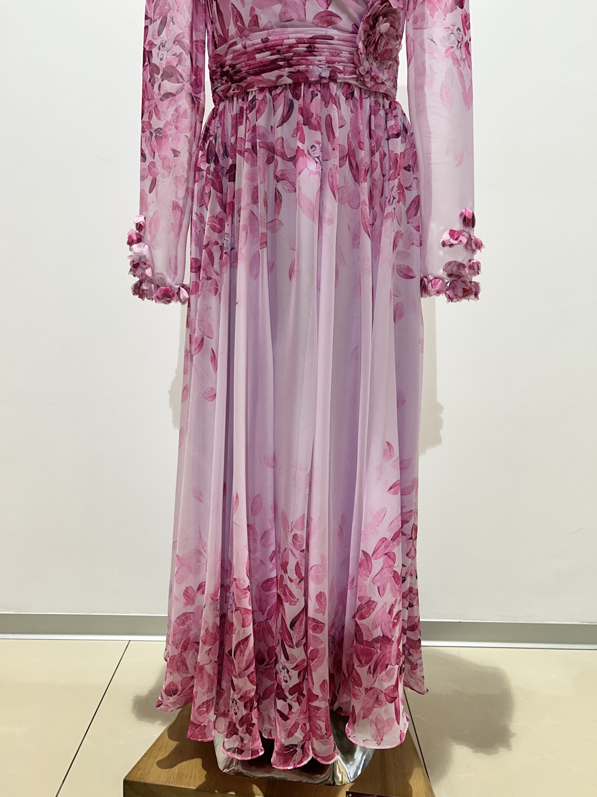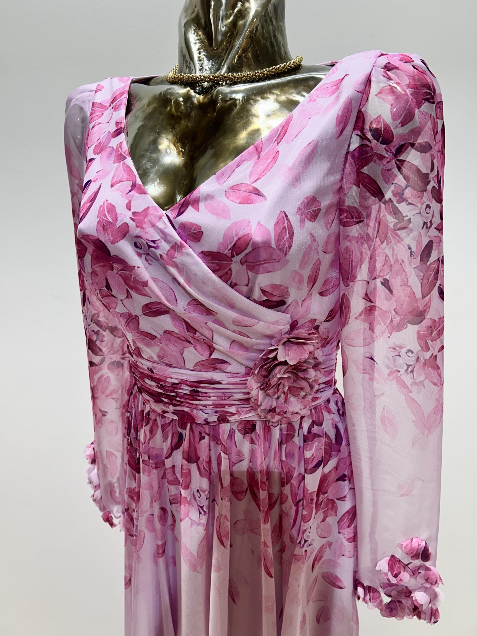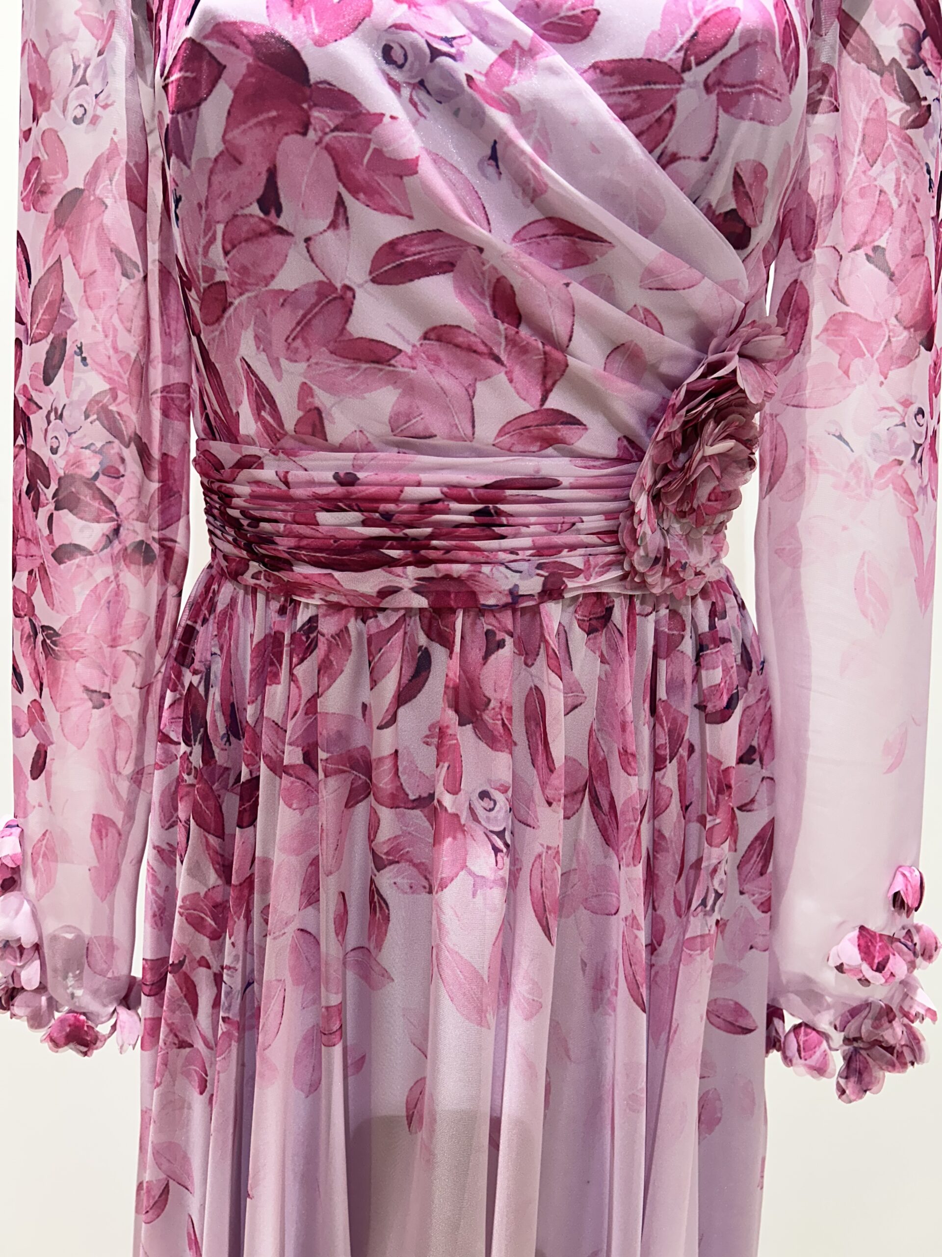 Šaty s jemným opaskom sú z ľahkého materiálu a sú podšité. Prekrásny ženský strih doplnený riasením v páse a kvetmi.